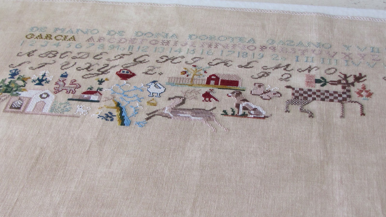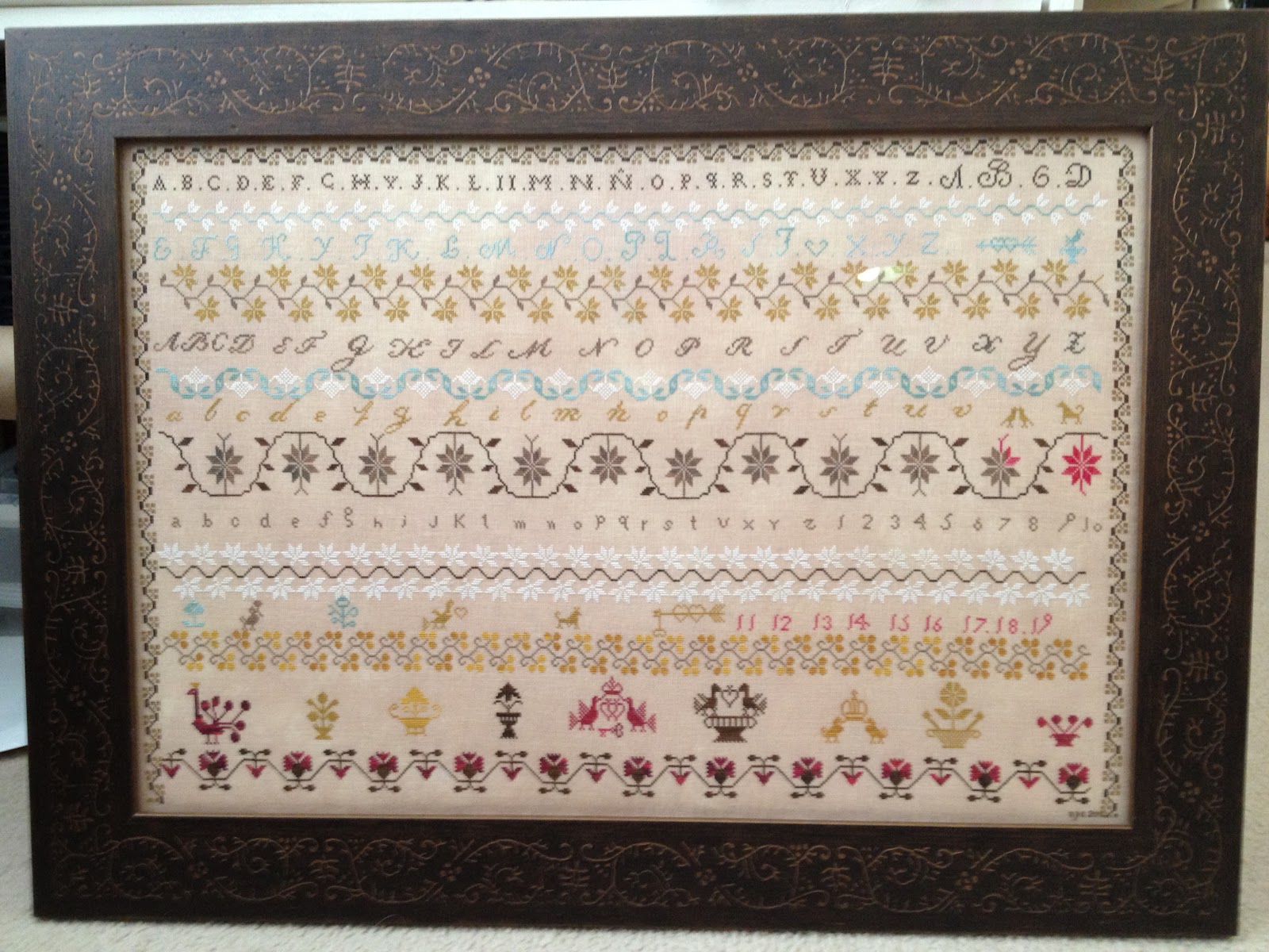 Remember my Spanish Mystery Sampler??? Here it is, in all its glory. I finally got it all framed and I am so happy with the frame I chose.