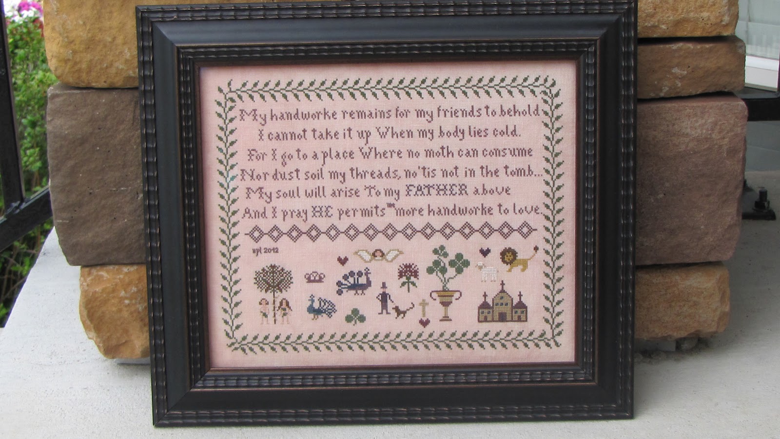 The thing that attracted me the most to this little sampler was the verse. Isn't it just absolutely beautiful and meaningful. I do hope God will allow us to stitch in heaven, don't you?