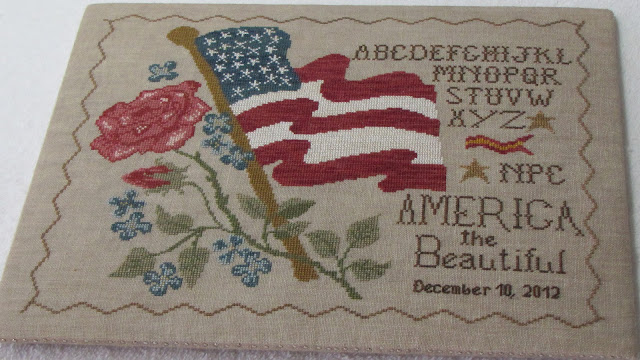 El 10 de Diciembre del 2012 obtuve la ciudadanía Americana en una ceremonia preciosa. En honor de este acontecimiento, he bordado un diseño llamado America The Beautiful, de Blackbird Designs... Lo he personalizado con la fecha de mi juramento como ciudadana Americana y he cambiado la bandera pequeñita de la Americana a la Española, ya que tengo doble ciudadanía.
